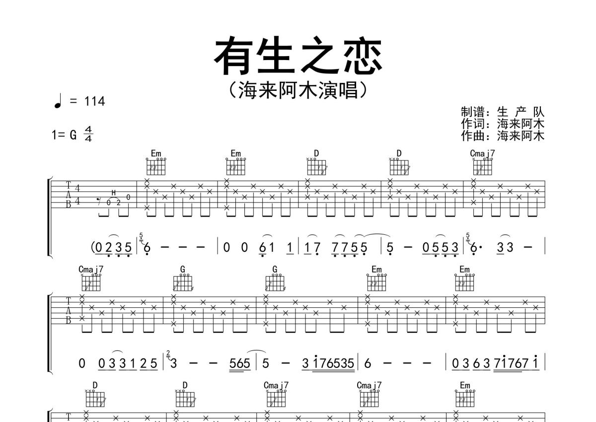 《有生之恋》是海来阿木演唱的一首歌曲,精编民谣版,拍号为4/4拍,歌曲速度为每分钟114拍,歌曲原调为G调,本吉他谱采用的是G调指法编配,演奏时不需要使用变调夹即为原调,这份吉他谱共有三张高清图谱,图谱由 @生产队 编配上传,图谱使用六线谱编配,包含吉他和弦指法、简谱以及歌词部分,使用这份有生之恋吉他谱,可以让你更加方便地掌握这首歌曲的弹唱技巧,快来尝试吧。海来阿木演唱的经典歌曲《有生之恋》原版吉他谱,完整的前奏、间奏solo编配。