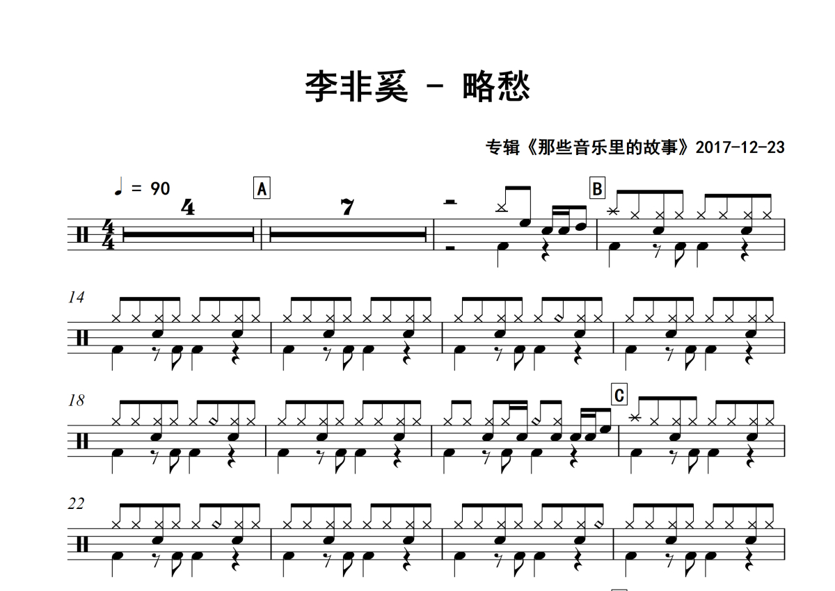 《略愁》是李非奚演唱的一首歌曲,专辑版,拍号为4/4拍,歌曲速度为每分钟90拍,这份架子鼓谱共有两张高清图谱,图谱由 @Sawubona 编配上传,图谱使用五线谱编配,使用这份略愁架子鼓谱,你将能够轻松地敲打出这首李非奚的略愁,快来尝试吧。