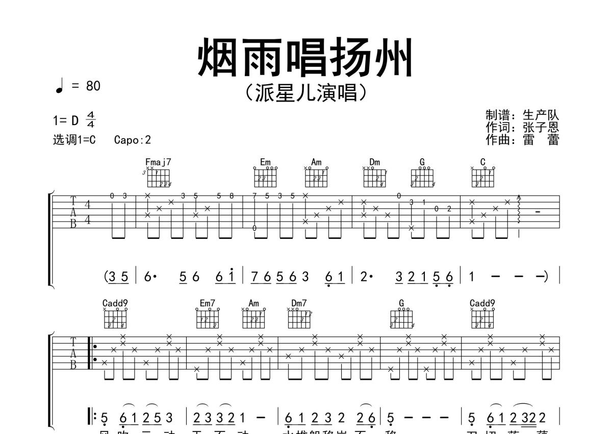《烟雨唱杨州》是派星儿演唱的一首歌曲,精编完美版,拍号为4/4拍,歌曲速度为每分钟80拍,歌曲原调为D调,但由于原调指法比较难,为了方便弹奏,本吉他谱采用的是C调指法编配,变调夹2品弹奏即为原调,当然也可以根据自己的音域改变变调夹位置,或者通过改变和弦调性,以方便自己弹奏,这份吉他谱共有两张高清图谱,图谱由 @生产队 编配上传,图谱使用六线谱编配,包含吉他和弦指法、简谱以及歌词部分,使用这份烟雨唱杨州吉他谱,可以让你更加方便地掌握这首歌曲的弹唱技巧,快来尝试吧。派星儿翻唱的经典歌曲《烟雨唱杨州》(女生版)原版吉他谱,精准的前奏、间奏、尾奏solo编配。
