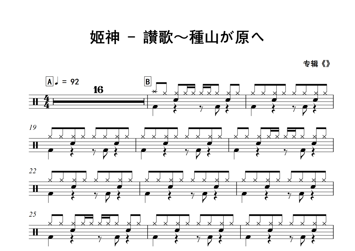《讃歌~種山が原へ》是姬神演唱的一首歌曲,专辑版,拍号为4/4拍,歌曲速度为每分钟92拍,这份架子鼓谱共有三张高清图谱,图谱由 @Sawubona 编配上传,图谱使用五线谱编配,使用这份讃歌~種山が原へ架子鼓谱,你将能够轻松地敲打出这首姬神的讃歌~種山が原へ,快来尝试吧。