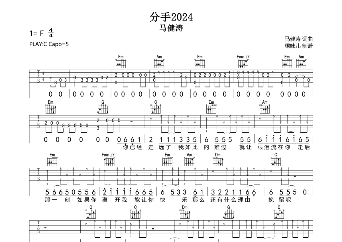 马健涛《分手2024》吉他谱 - C调弹唱六线谱