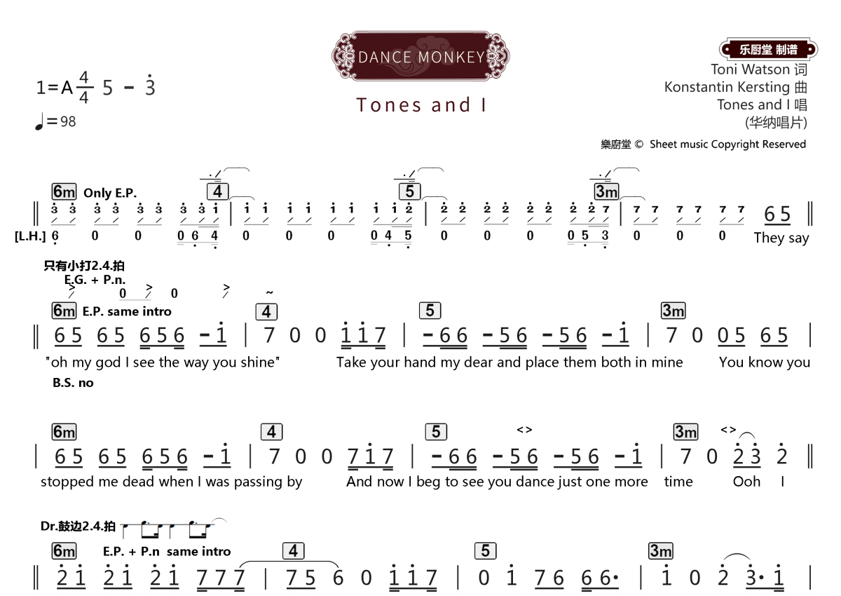 《DANCE MONKEY》是Tones and I演唱的一首歌曲,拍号为4/4拍,歌曲速度为每分钟98拍,这份乐队总谱共有两张高清图谱,图谱由 @乐厨堂 编配上传。