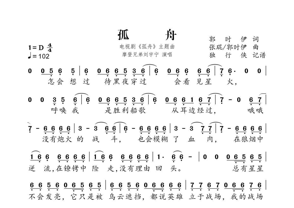 《孤舟》是摩登兄弟刘宇宁演唱的一首歌曲,拍号为4/4拍,歌曲速度为每分钟102拍,这份简谱共有一张高清图谱,图谱由 @独行侠 编配上传。