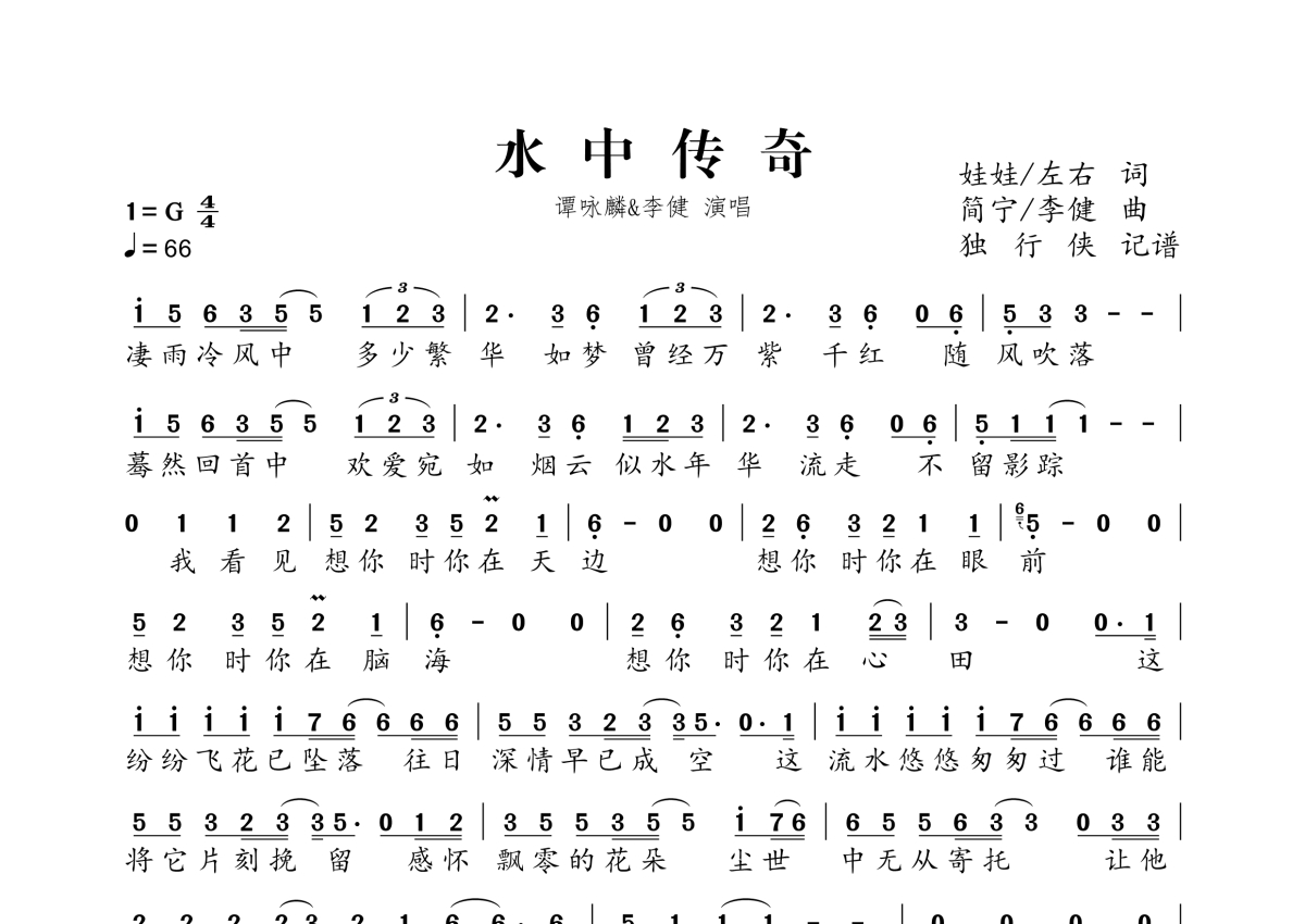 《水中传奇》是李健、谭咏麟演唱的一首歌曲,这份简谱共有两张高清图谱,图谱由 @独行侠 编配上传。