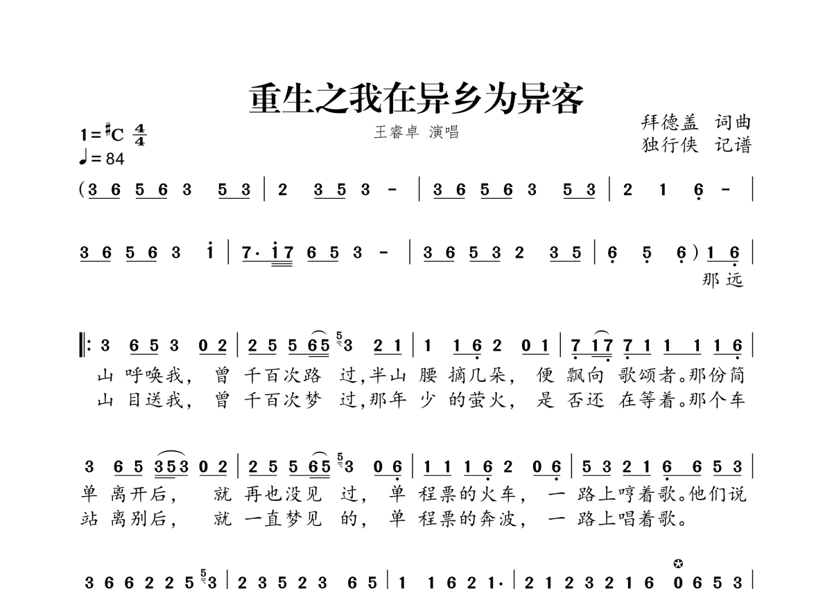 《重生之我在异乡为异客》是王睿卓演唱的一首歌曲,拍号为4/4拍,歌曲速度为每分钟84拍,这份简谱共有一张高清图谱,图谱由 @独行侠 编配上传。
