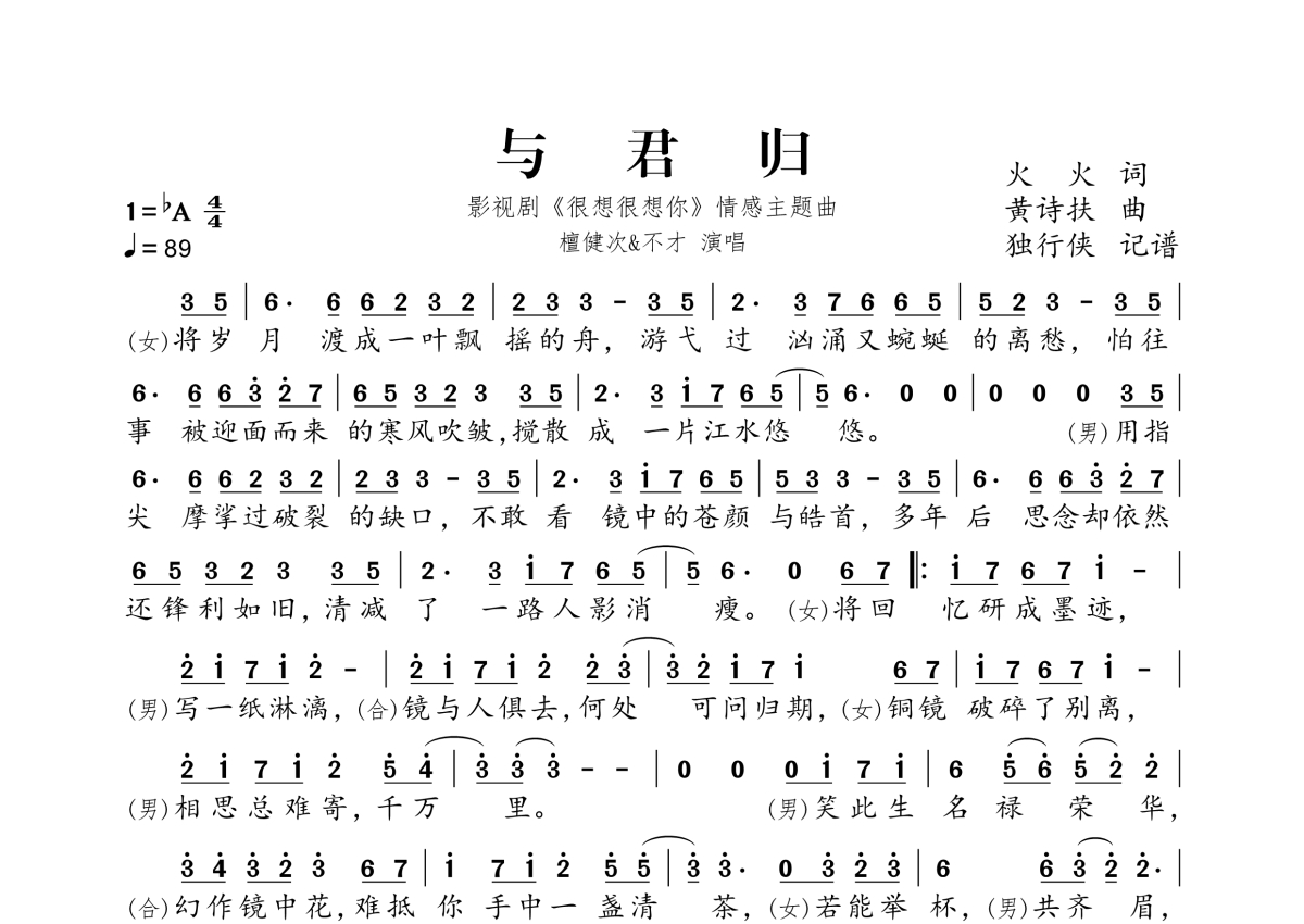 《与君归》是檀健次/不才演唱的一首歌曲,拍号为4/4拍,歌曲速度为每分钟89拍,这份简谱共有一张高清图谱,图谱由 @独行侠 编配上传。
