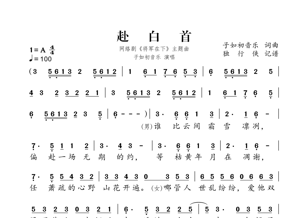 《赴白首》是子如初音乐演唱的一首歌曲,拍号为4/4拍,歌曲速度为每分钟100拍,这份简谱共有两张高清图谱,图谱由 @独行侠 编配上传。