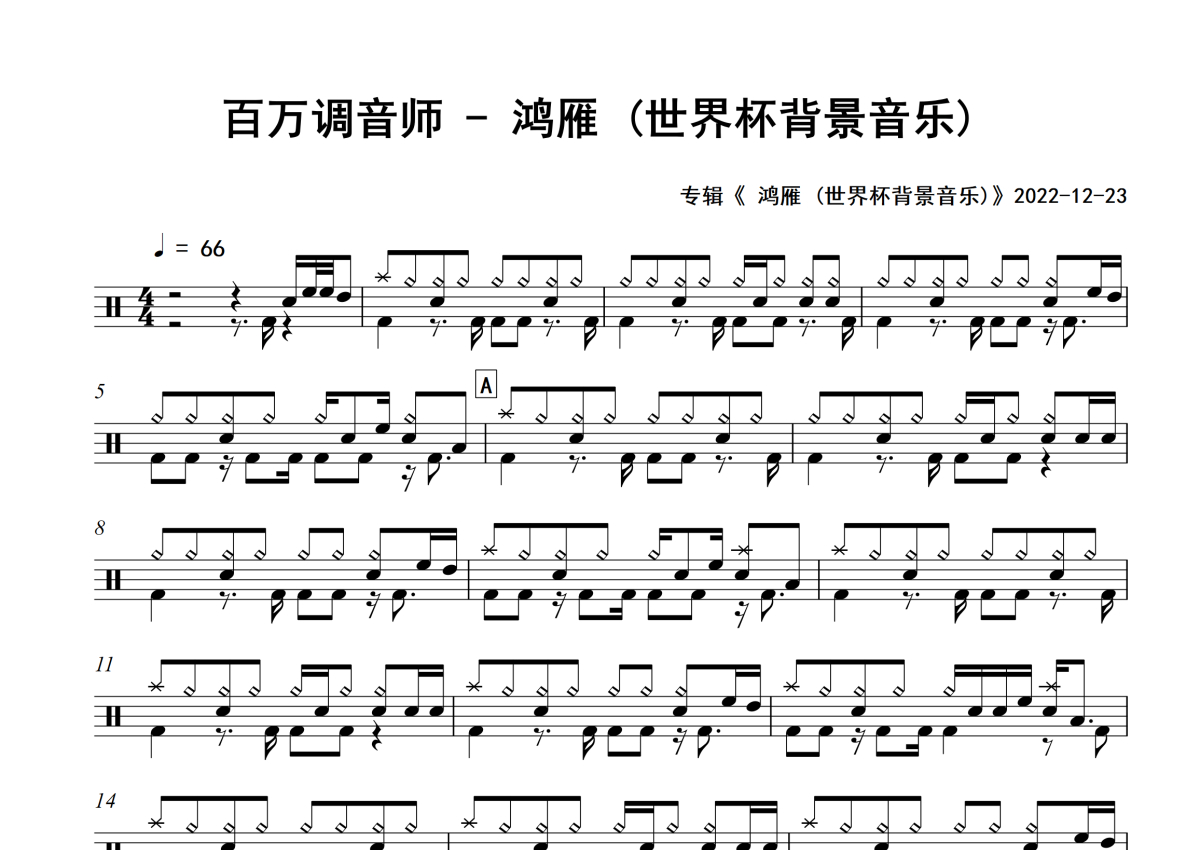 《鸿雁 (世界杯背景音乐)》是百万调音师演唱的一首歌曲,专辑版,拍号为4/4拍,歌曲速度为每分钟66拍,这份架子鼓谱共有两张高清图谱,图谱由 @积极处世 编配上传,图谱使用五线谱编配,使用这份鸿雁 (世界杯背景音乐)架子鼓谱,你将能够轻松地敲打出这首百万调音师的鸿雁 (世界杯背景音乐),快来尝试吧。