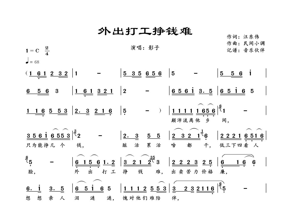 《外出打工挣钱难》是影子演唱的一首歌曲,拍号为2/4拍,歌曲速度为每分钟68拍,这份简谱共有一张高清图谱,图谱由 @音乐伙伴 编配上传。
