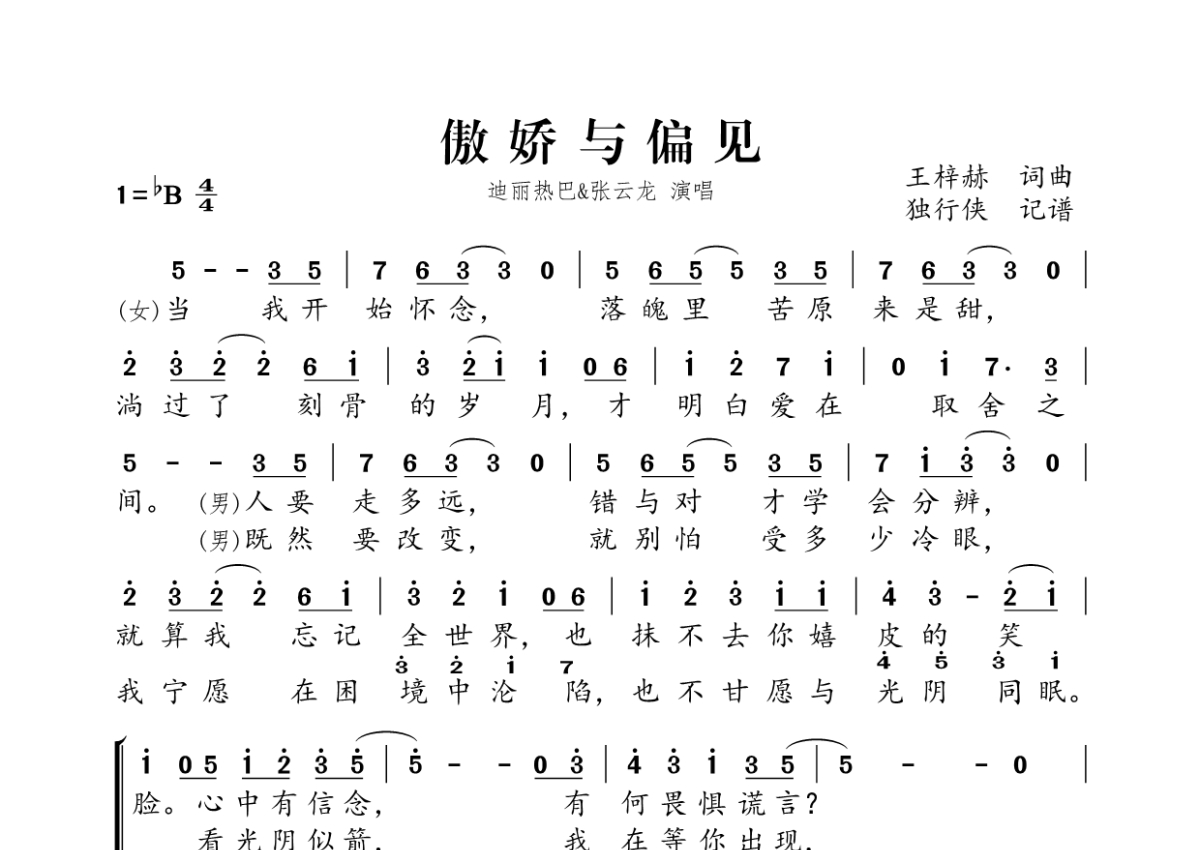 《傲娇与偏见》是迪丽热巴&张云龙演唱的一首歌曲,拍号为4/4拍,这份简谱共有一张高清图谱,图谱由 @独行侠 编配上传。