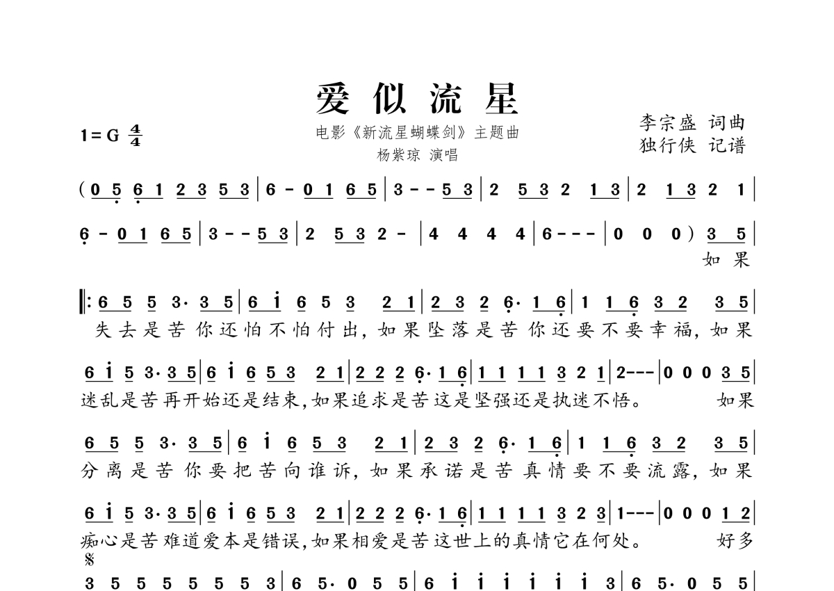 《爱似流星》是张紫琼演唱的一首歌曲,拍号为4/4拍,这份简谱共有一张高清图谱,图谱由 @独行侠 编配上传。