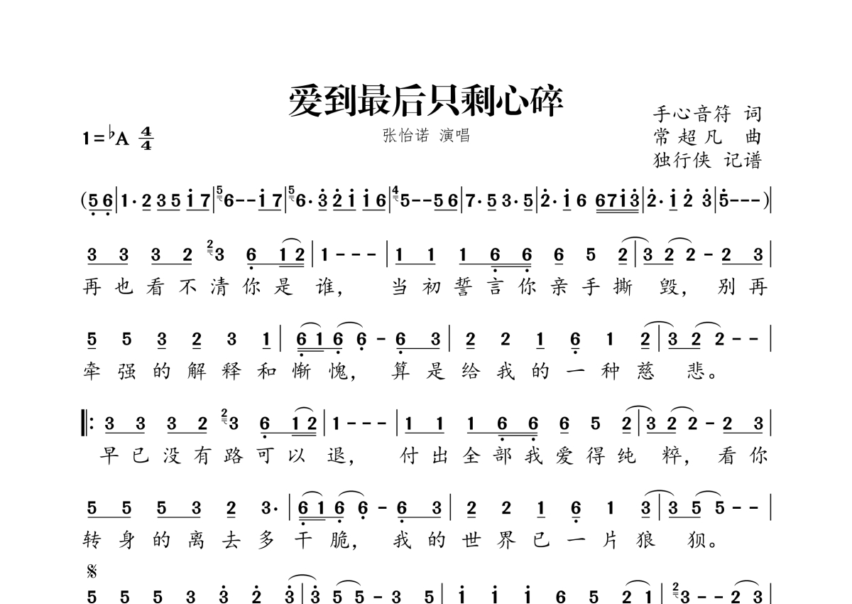 《爱到最后只剩心碎》是张怡诺演唱的一首歌曲,拍号为4/4拍,这份简谱共有一张高清图谱,图谱由 @独行侠 编配上传。