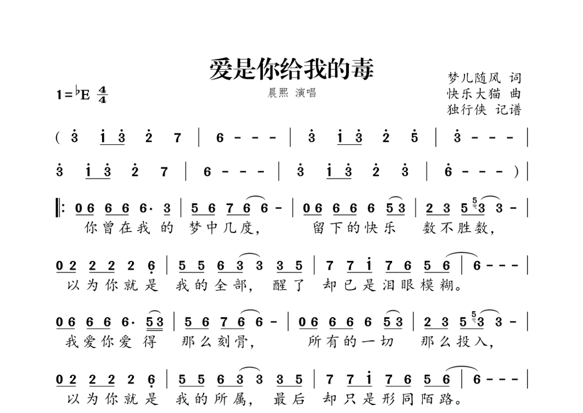 《爱是你给我的毒》是晨熙演唱的一首歌曲,拍号为4/4拍,这份简谱共有一张高清图谱,图谱由 @独行侠 编配上传。