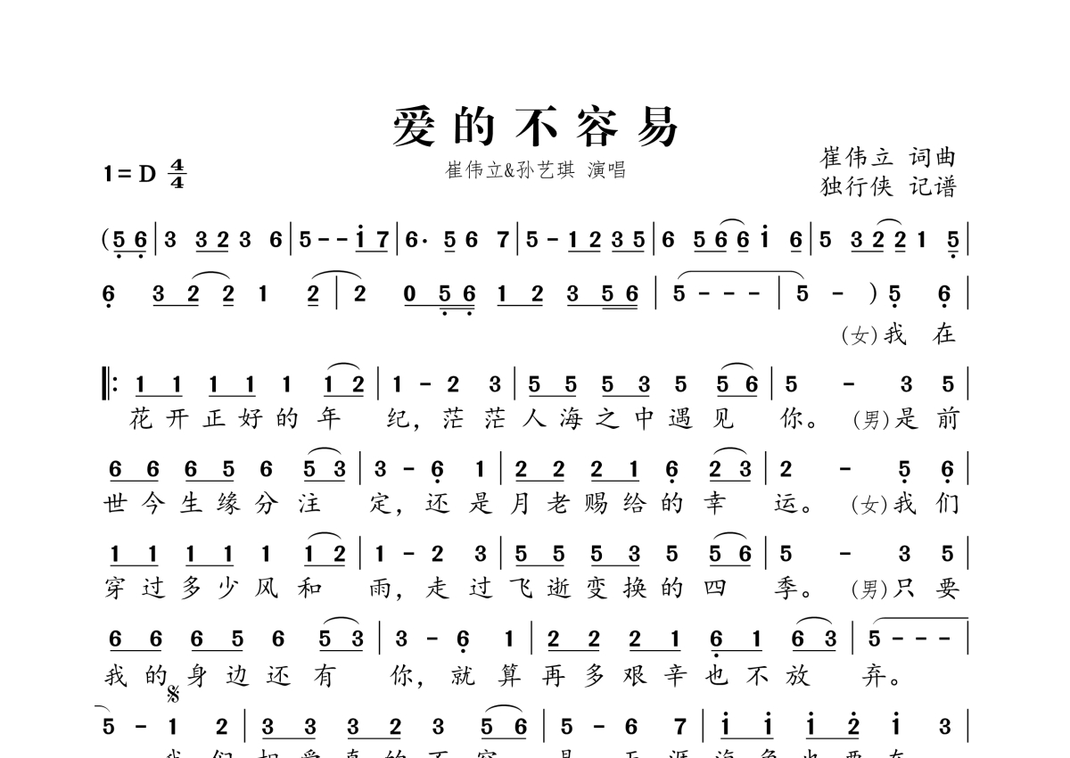《爱的不容易》是崔伟立&孙艺琪演唱的一首歌曲,拍号为4/4拍,这份简谱共有一张高清图谱,图谱由 @独行侠 编配上传。