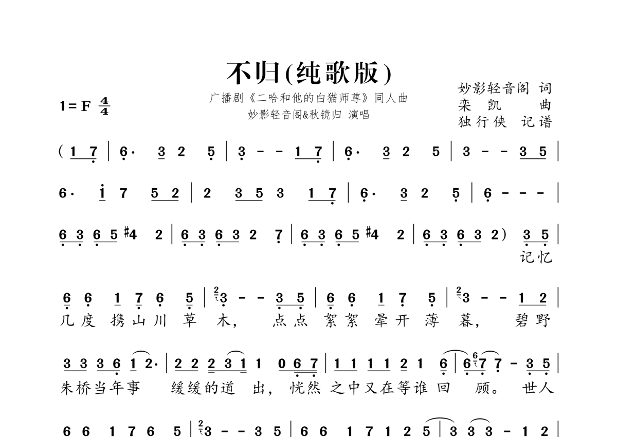 《不归》是妙影轻音阁&秋镜归演唱的一首歌曲,纯歌版,拍号为4/4拍,这份简谱共有两张高清图谱,图谱由 @独行侠 编配上传。