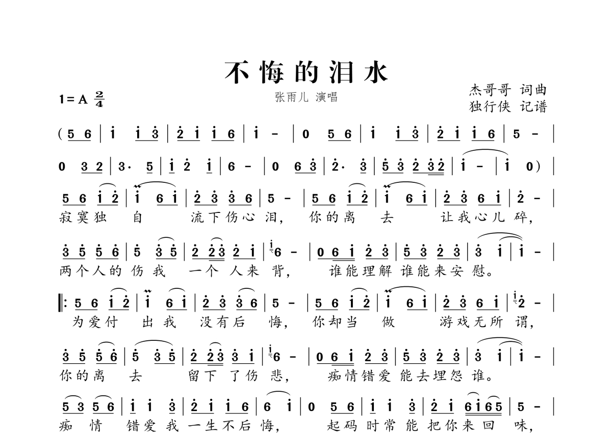 《不悔的泪水》是张雨儿演唱的一首歌曲,拍号为2/4拍,这份简谱共有一张高清图谱,图谱由 @独行侠 编配上传。