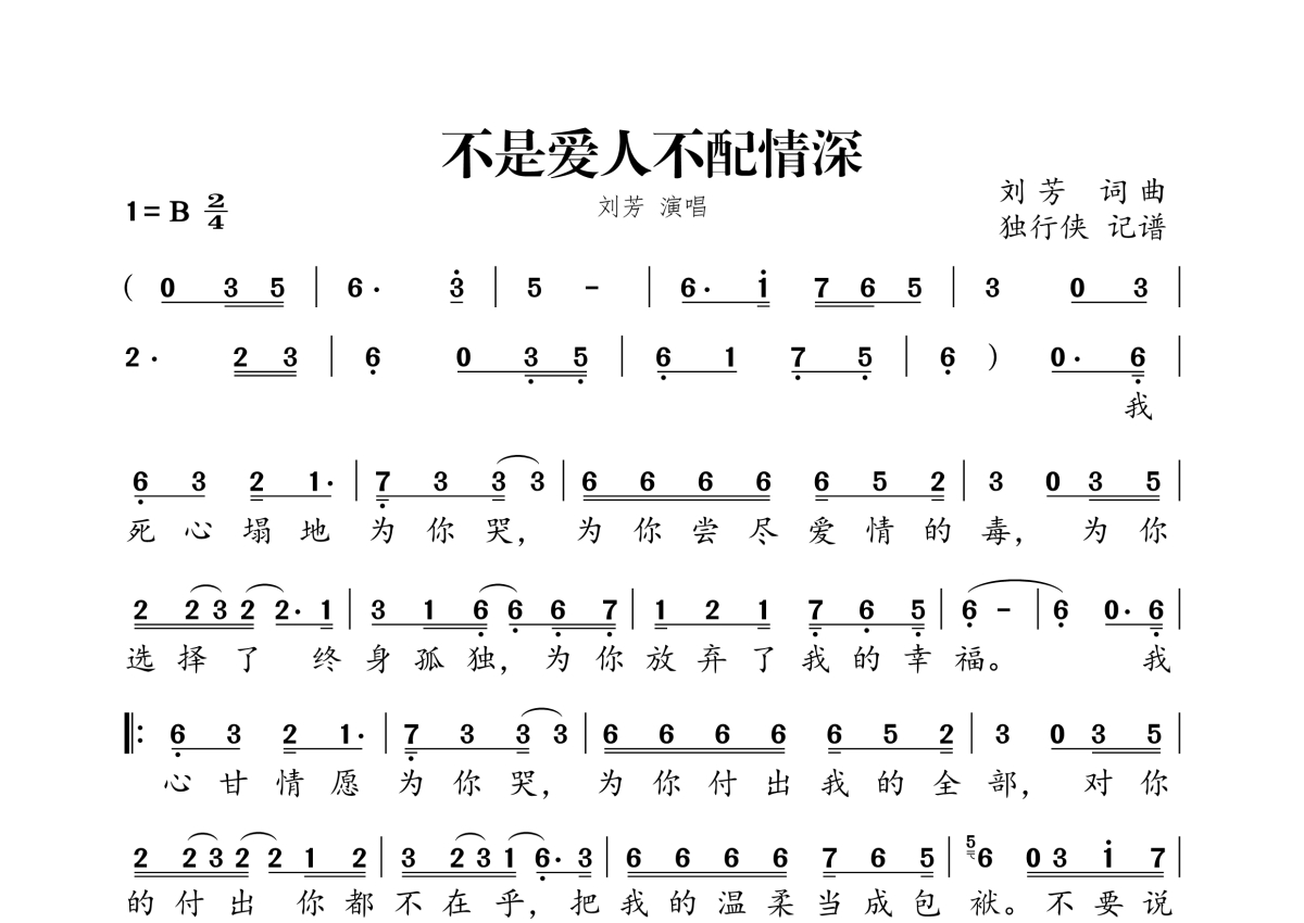 《不是爱人不配情深》是刘芳演唱的一首歌曲,拍号为2/4拍,这份简谱共有一张高清图谱,图谱由 @独行侠 编配上传。