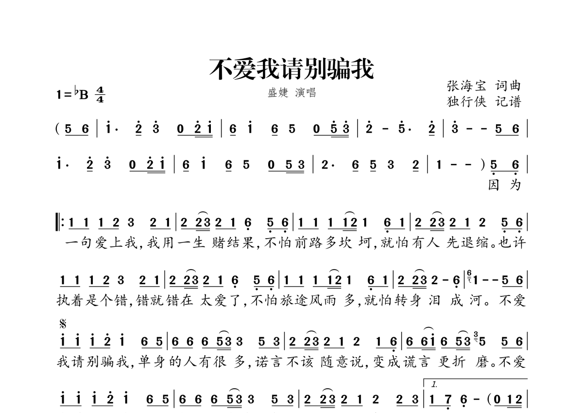《不爱我请别骗我》是盛婕演唱的一首歌曲,拍号为4/4拍,这份简谱共有一张高清图谱,图谱由 @独行侠 编配上传。