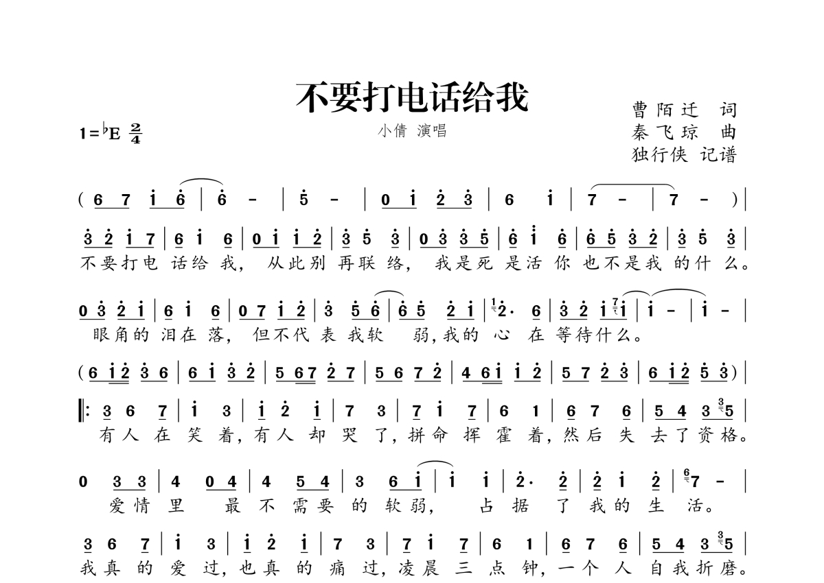 《不要打电话给我》是小倩演唱的一首歌曲,拍号为2/4拍,这份简谱共有一张高清图谱,图谱由 @独行侠 编配上传。