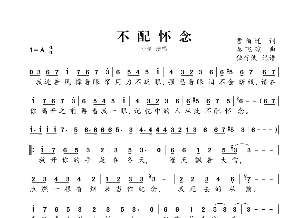 《不配怀念》是小倩演唱的一首歌曲,拍号为4/4拍,这份简谱共有一张高清图谱,图谱由 @独行侠 编配上传。