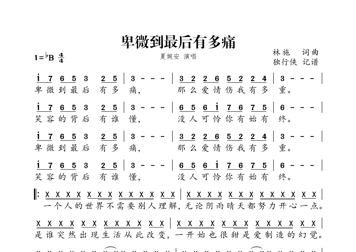 《卑微到最后有多痛》是夏婉安演唱的一首歌曲,拍号为4/4拍,这份简谱共有一张高清图谱,图谱由 @独行侠 编配上传。