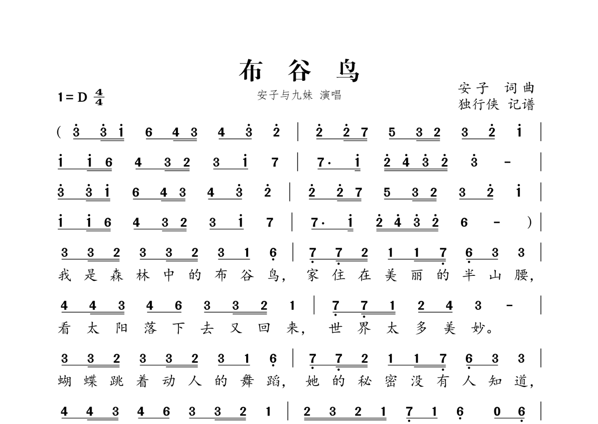 《布谷鸟》是安子与九妹乐队演唱的一首歌曲,拍号为4/4拍,这份简谱共有两张高清图谱,图谱由 @独行侠 编配上传。