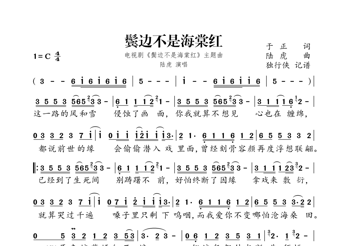 《鬓边不是海棠红》是陆虎演唱的一首歌曲,拍号为4/4拍,这份简谱共有一张高清图谱,图谱由 @独行侠 编配上传。