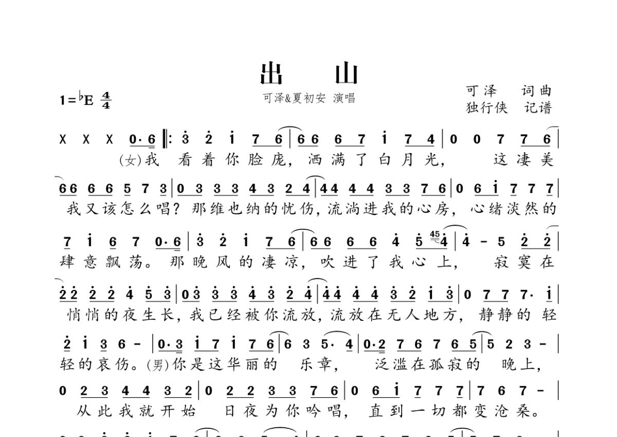 《出山》是可泽、夏初安演唱的一首歌曲,拍号为4/4拍,这份简谱共有一张高清图谱,图谱由 @独行侠 编配上传。