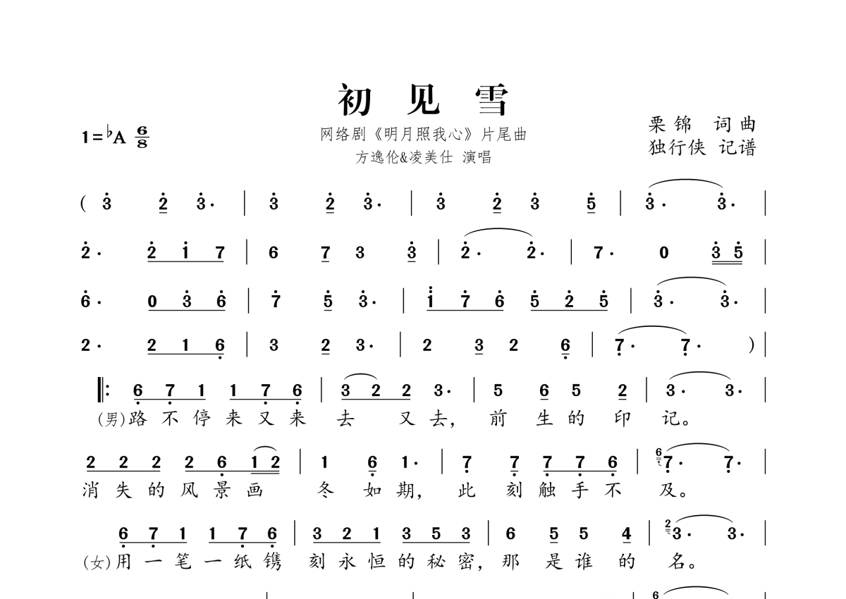 《初见雪》是方逸伦&凌美仕演唱的一首歌曲,拍号为6/8拍,这份简谱共有一张高清图谱,图谱由 @独行侠 编配上传。