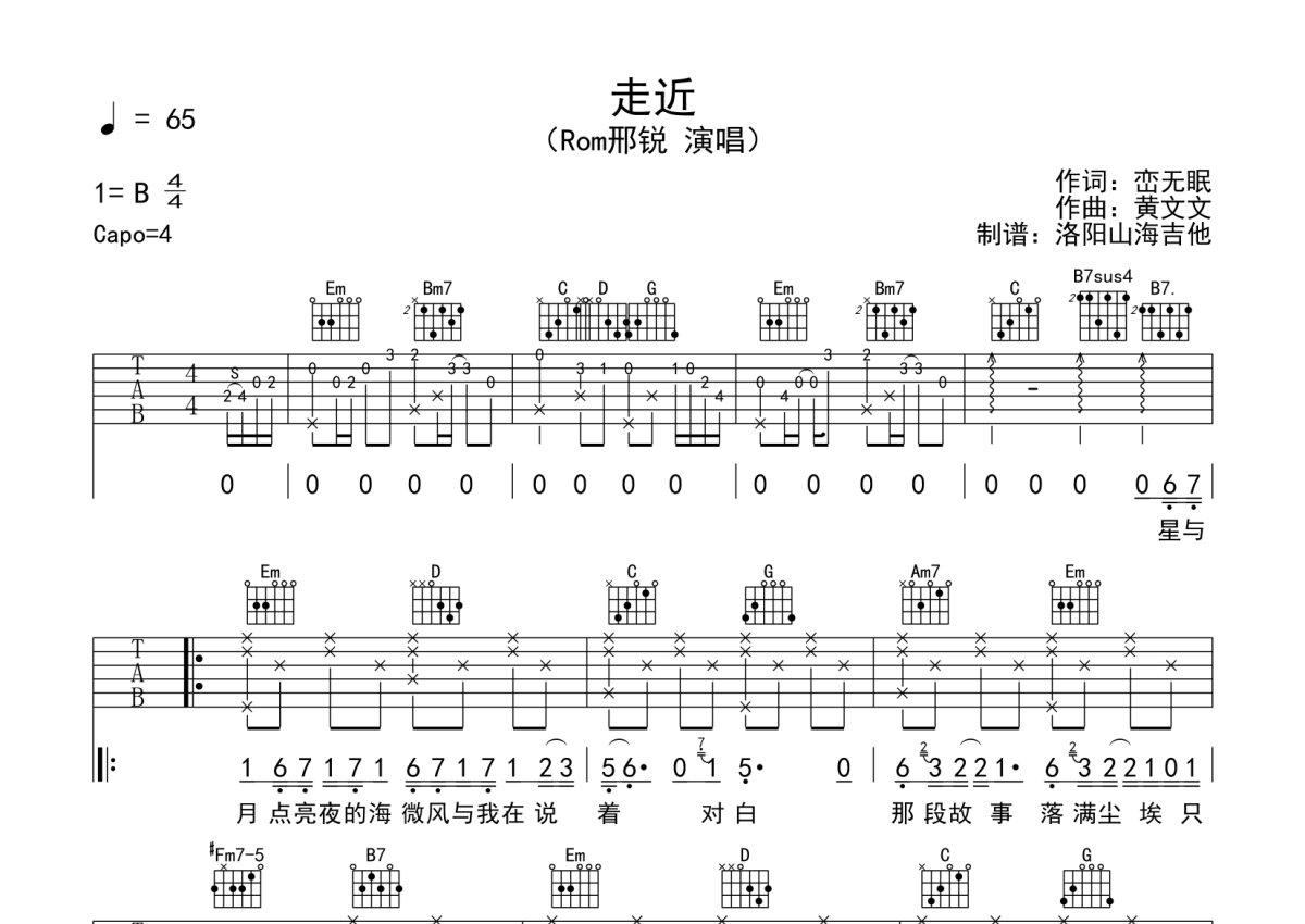《走近》是Rom邢锐演唱的一首歌曲,本吉他谱采用的是G调指法编配,这份吉他谱共有两张高清图谱,图谱由 @何奔洋 编配上传,图谱使用六线谱编配,包含吉他和弦指法、简谱以及歌词部分,曲谱配备了相关的音频提供试听,使用这份走近吉他谱,可以让你更加方便地掌握这首歌曲的弹唱技巧,快来尝试吧。Rom邢锐《走近》吉他谱_G调吉他弹唱谱。