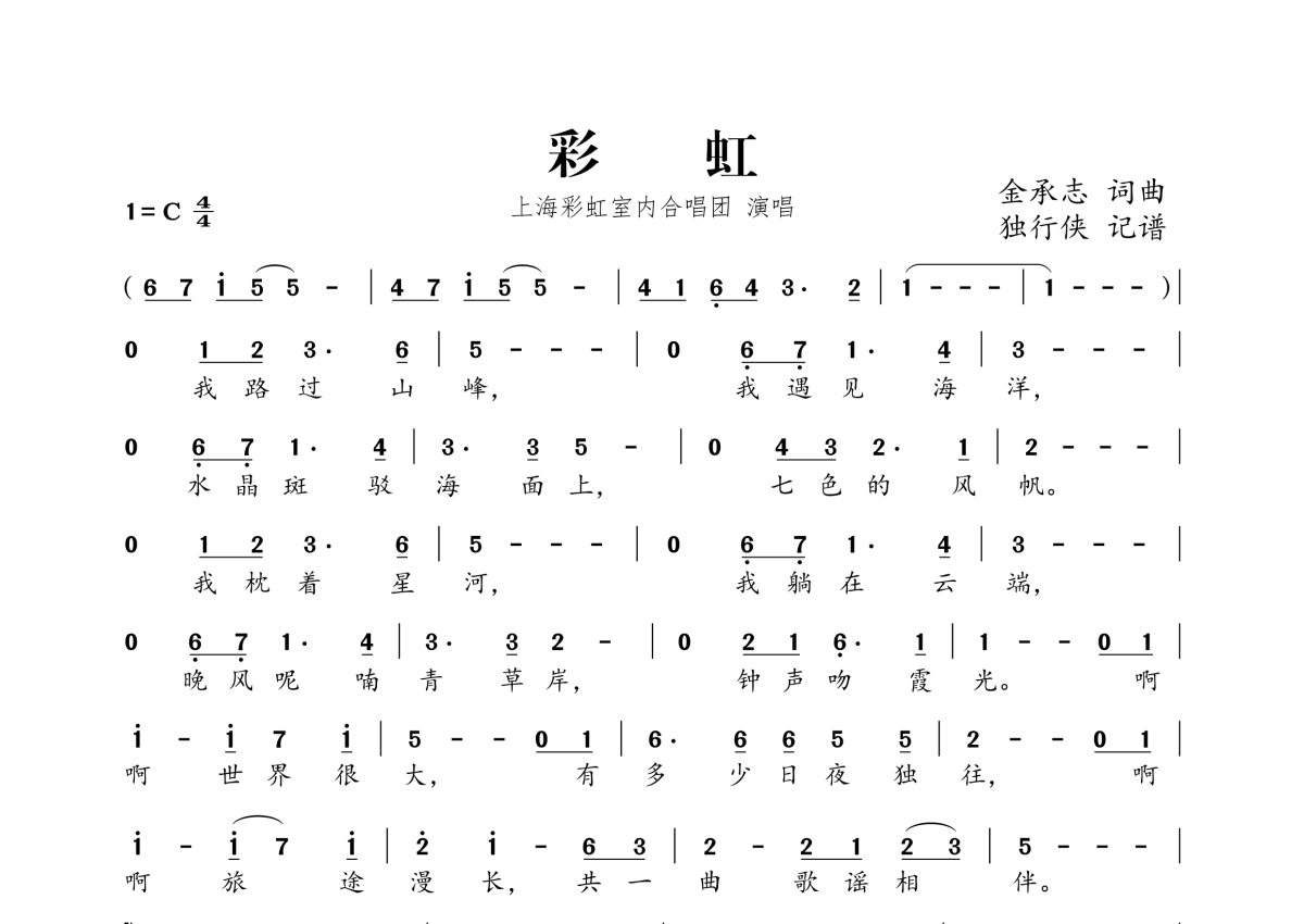 《彩虹》是上海彩虹室内合唱团演唱的一首歌曲,拍号为4/4拍,这份简谱共有一张高清图谱,图谱由 @独行侠 编配上传。