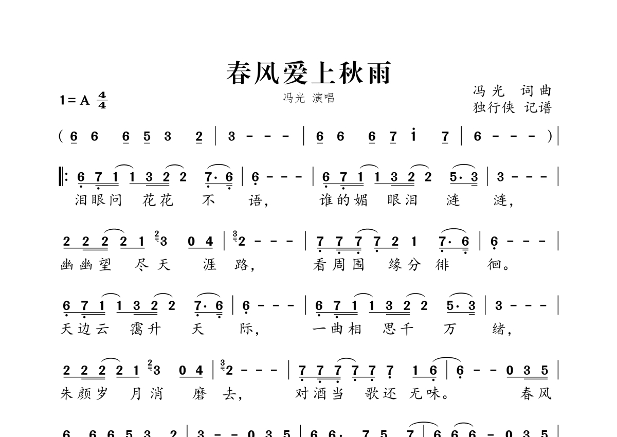 《春风爱上秋雨》是冯光演唱的一首歌曲,拍号为4/4拍,这份简谱共有一张高清图谱,图谱由 @独行侠 编配上传。