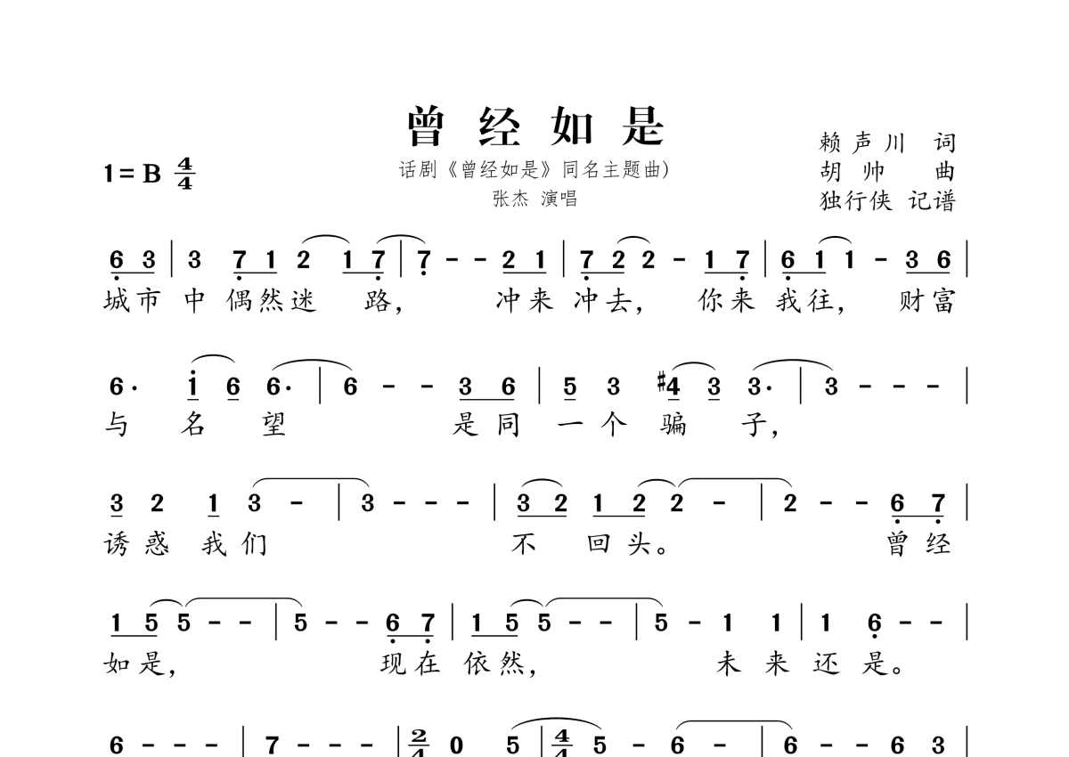 《曾经如是》是张杰演唱的一首歌曲,拍号为4/4拍,这份简谱共有一张高清图谱,图谱由 @独行侠 编配上传。