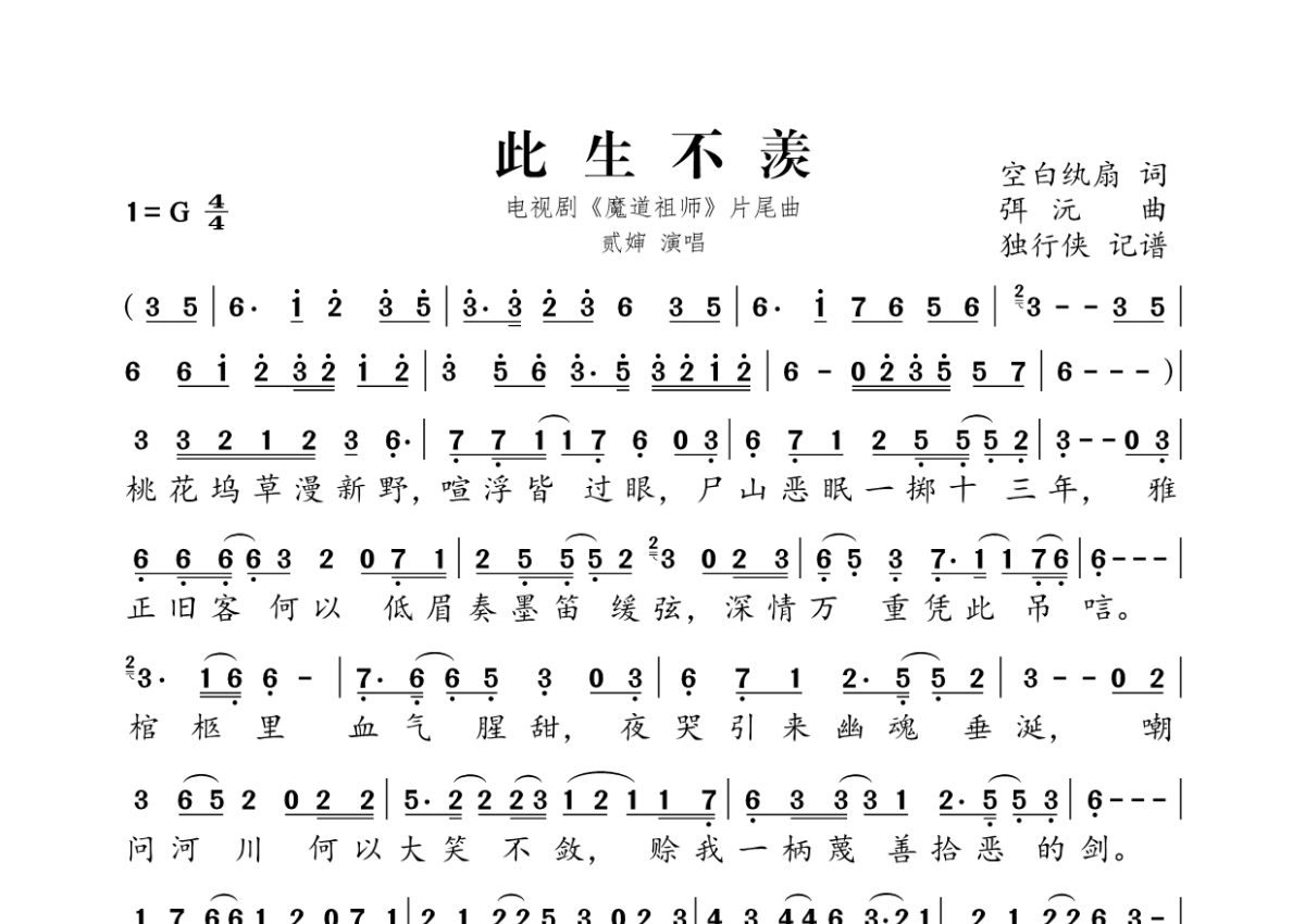 《此生不羡》是贰婶演唱的一首歌曲,拍号为4/4拍,这份简谱共有两张高清图谱,图谱由 @独行侠 编配上传。
