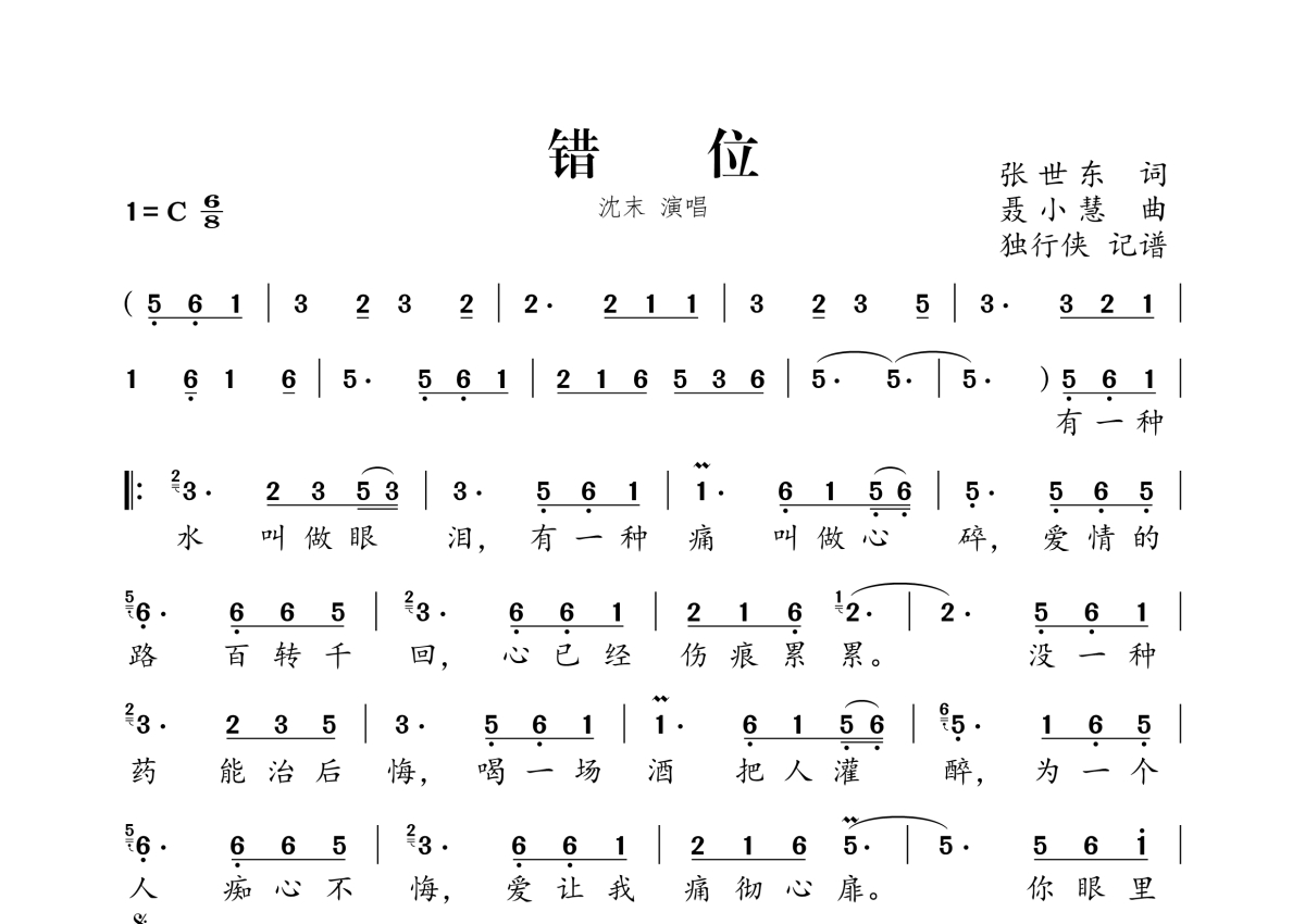 《错位》是沈末演唱的一首歌曲,拍号为6/8拍,这份简谱共有一张高清图谱,图谱由 @独行侠 编配上传。