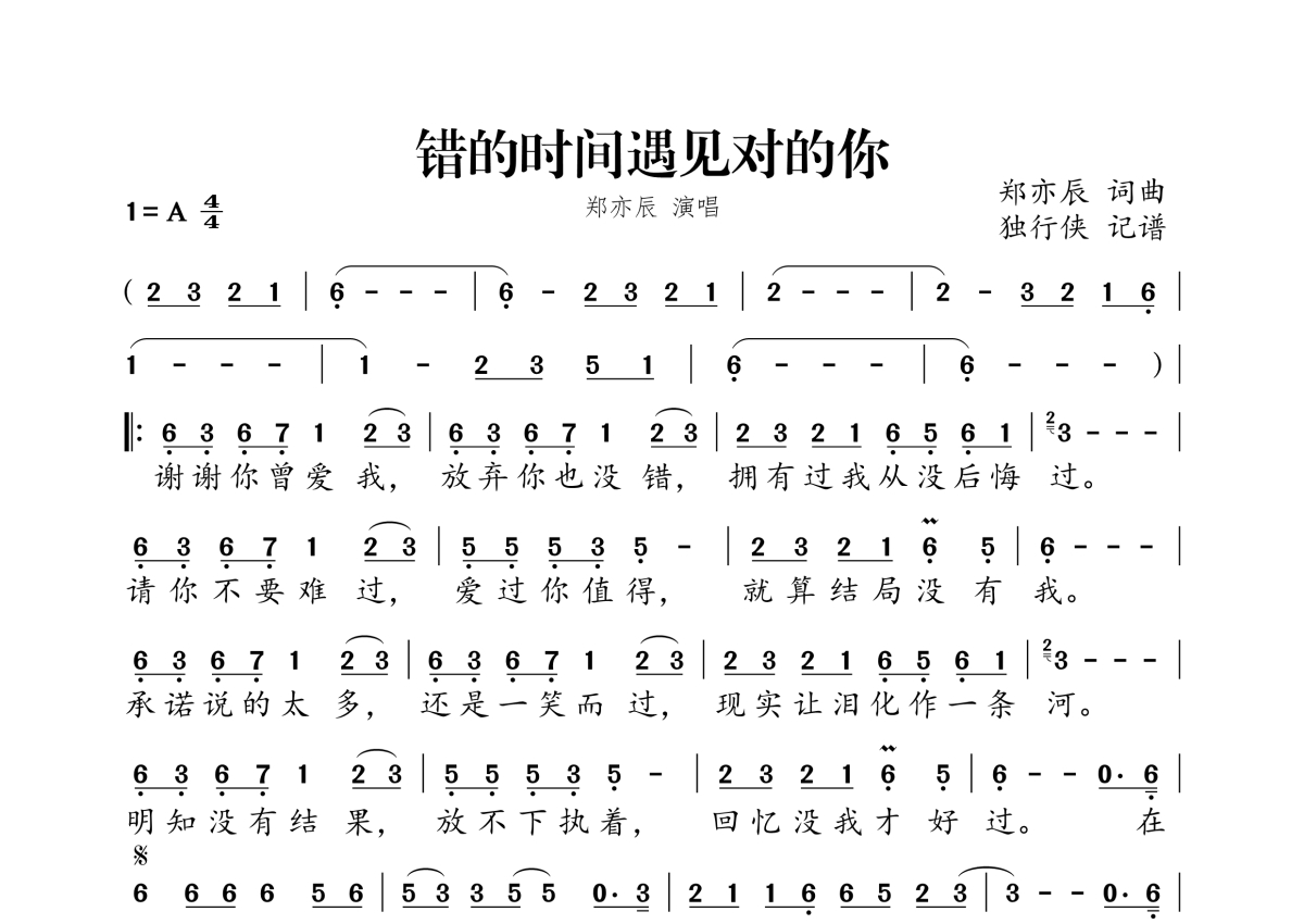 《错的时间遇见对的你》是郑亦辰演唱的一首歌曲,拍号为4/4拍,这份简谱共有一张高清图谱,图谱由 @独行侠 编配上传。