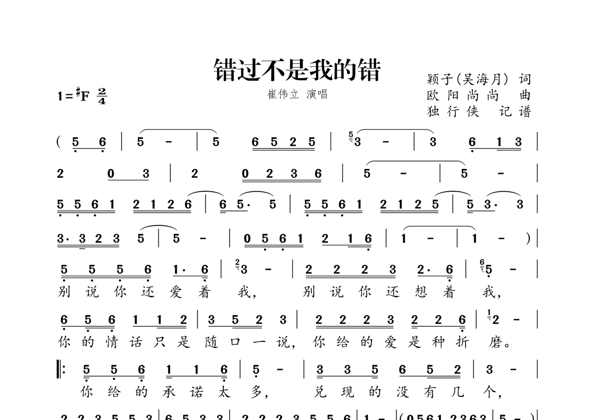 《错过不是我的错》是崔伟立演唱的一首歌曲,拍号为2/4拍,这份简谱共有一张高清图谱,图谱由 @独行侠 编配上传。