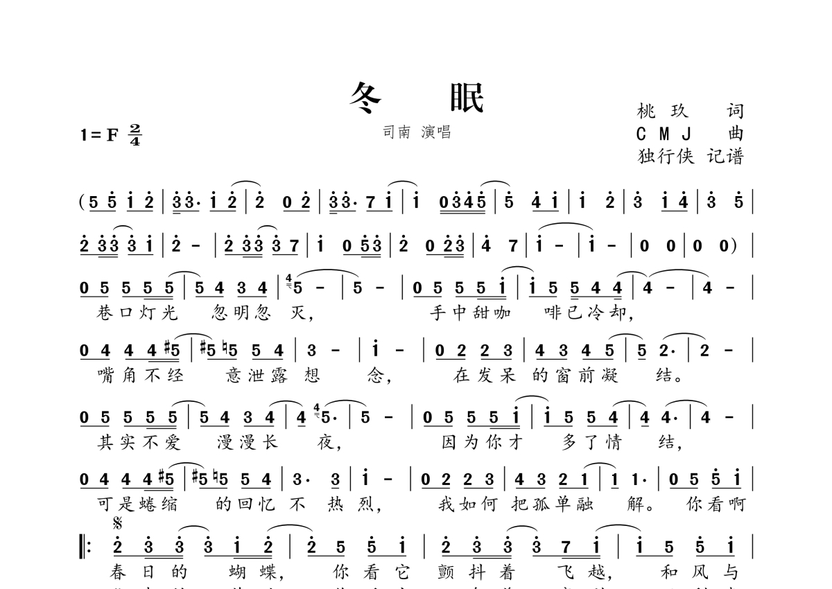 《冬眠》是司南演唱的一首歌曲,拍号为2/4拍,这份简谱共有一张高清图谱,图谱由 @独行侠 编配上传。