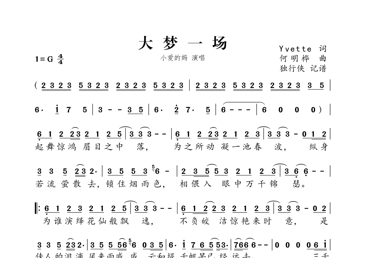 《大梦一场》是小爱的妈演唱的一首歌曲,拍号为4/4拍,这份简谱共有一张高清图谱,图谱由 @独行侠 编配上传。