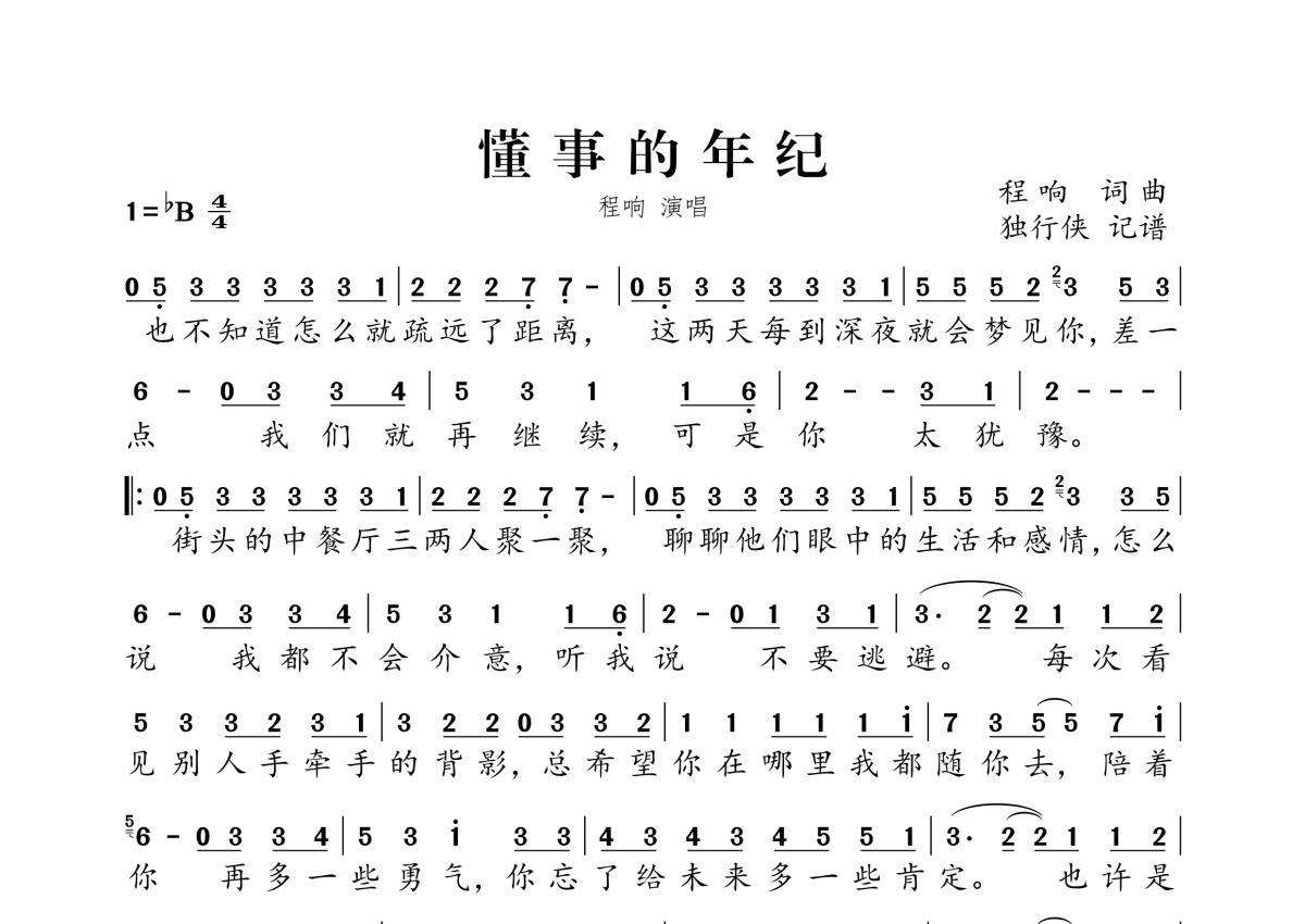 《懂事的年纪》是程响演唱的一首歌曲,拍号为4/4拍,这份简谱共有一张高清图谱,图谱由 @独行侠 编配上传。