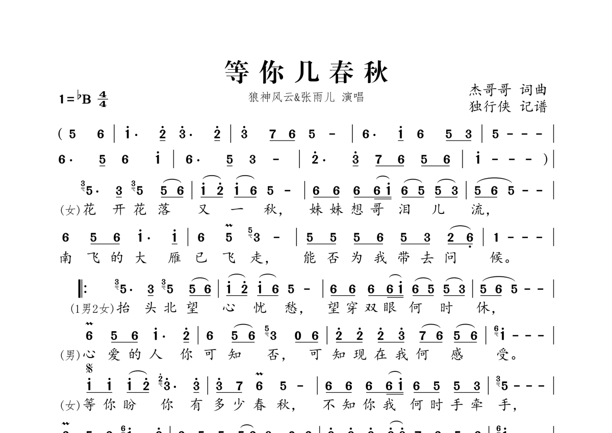 《等你几春秋》是狼神风云&张雨儿演唱的一首歌曲,拍号为4/4拍,这份简谱共有一张高清图谱,图谱由 @独行侠 编配上传。