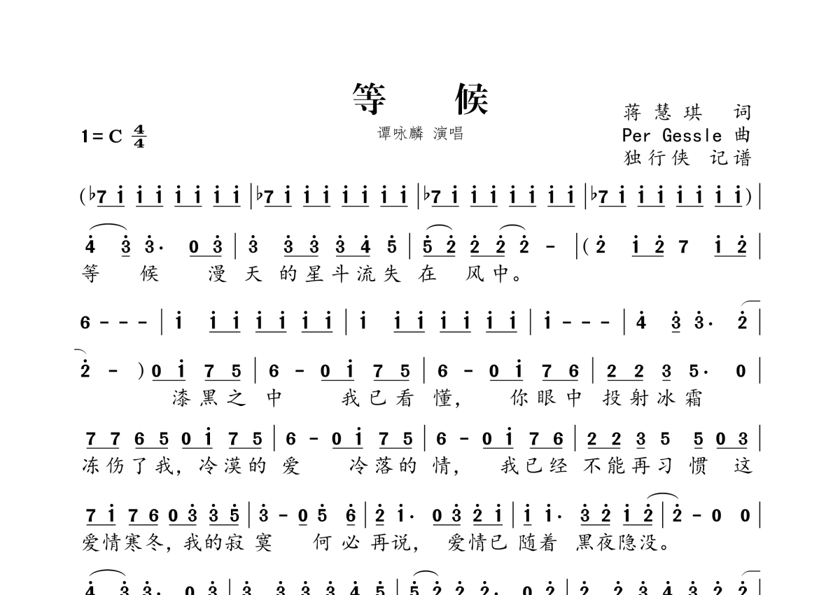 《等候》是谭咏麟演唱的一首歌曲,拍号为4/4拍,这份简谱共有两张高清图谱,图谱由 @独行侠 编配上传。