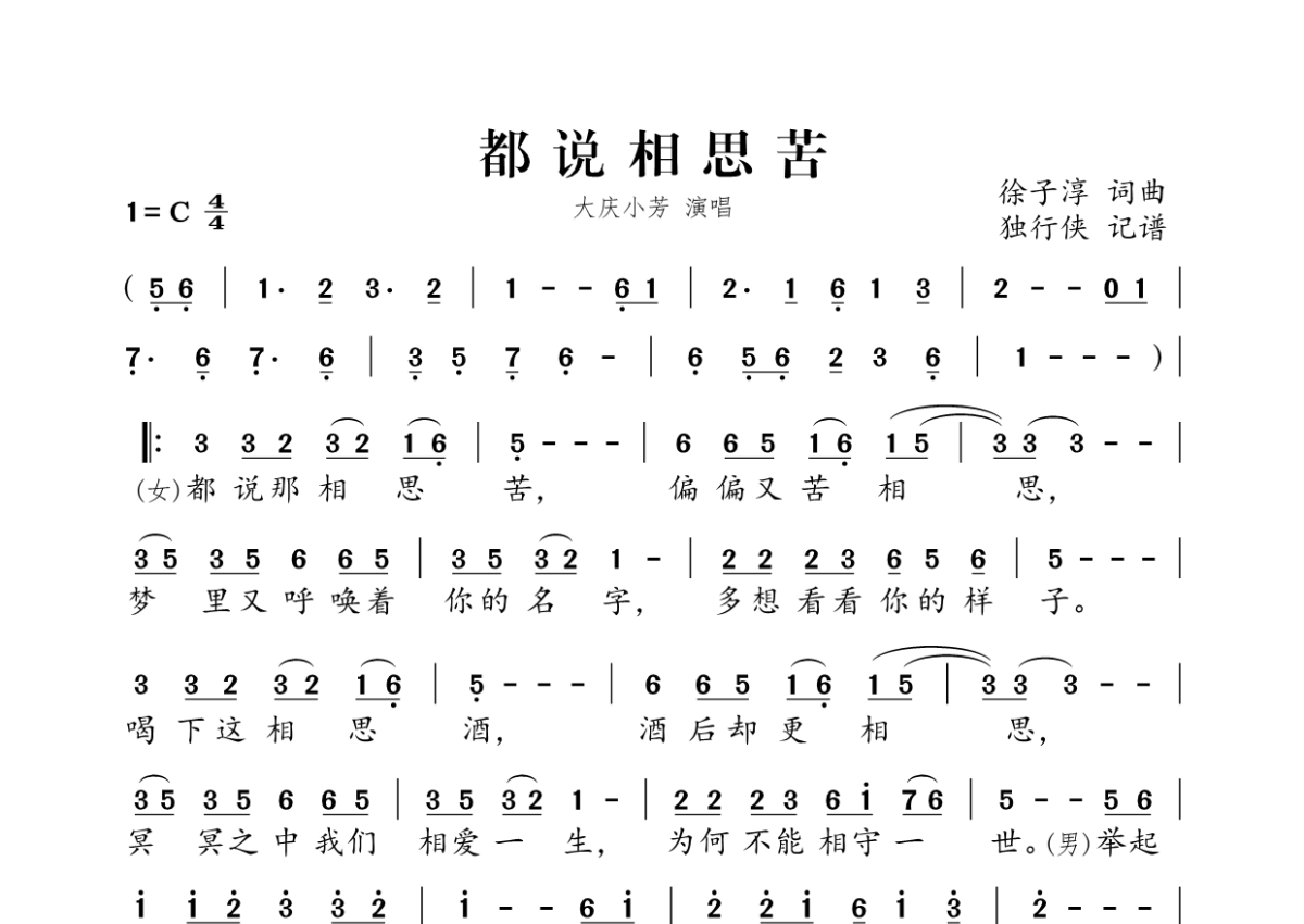 《都说相思苦》是大庆小芳演唱的一首歌曲,拍号为4/4拍,这份简谱共有一张高清图谱,图谱由 @独行侠 编配上传。