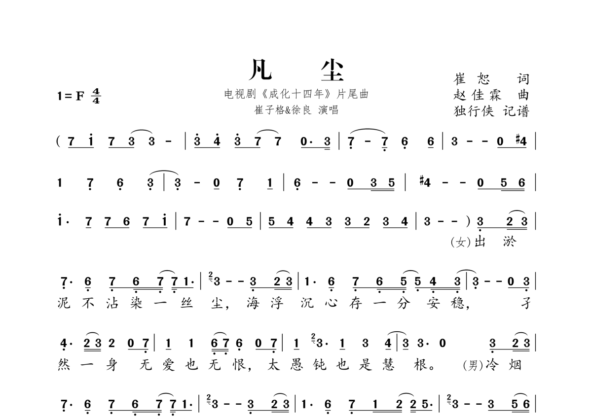 《凡尘》是崔子格、徐良演唱的一首歌曲,拍号为4/4拍,这份简谱共有两张高清图谱,图谱由 @独行侠 编配上传。