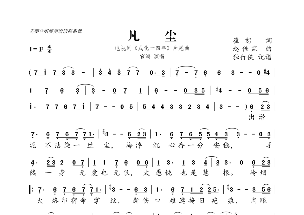 《凡尘》是官鸿演唱的一首歌曲,拍号为4/4拍,这份简谱共有一张高清图谱,图谱由 @独行侠 编配上传。
