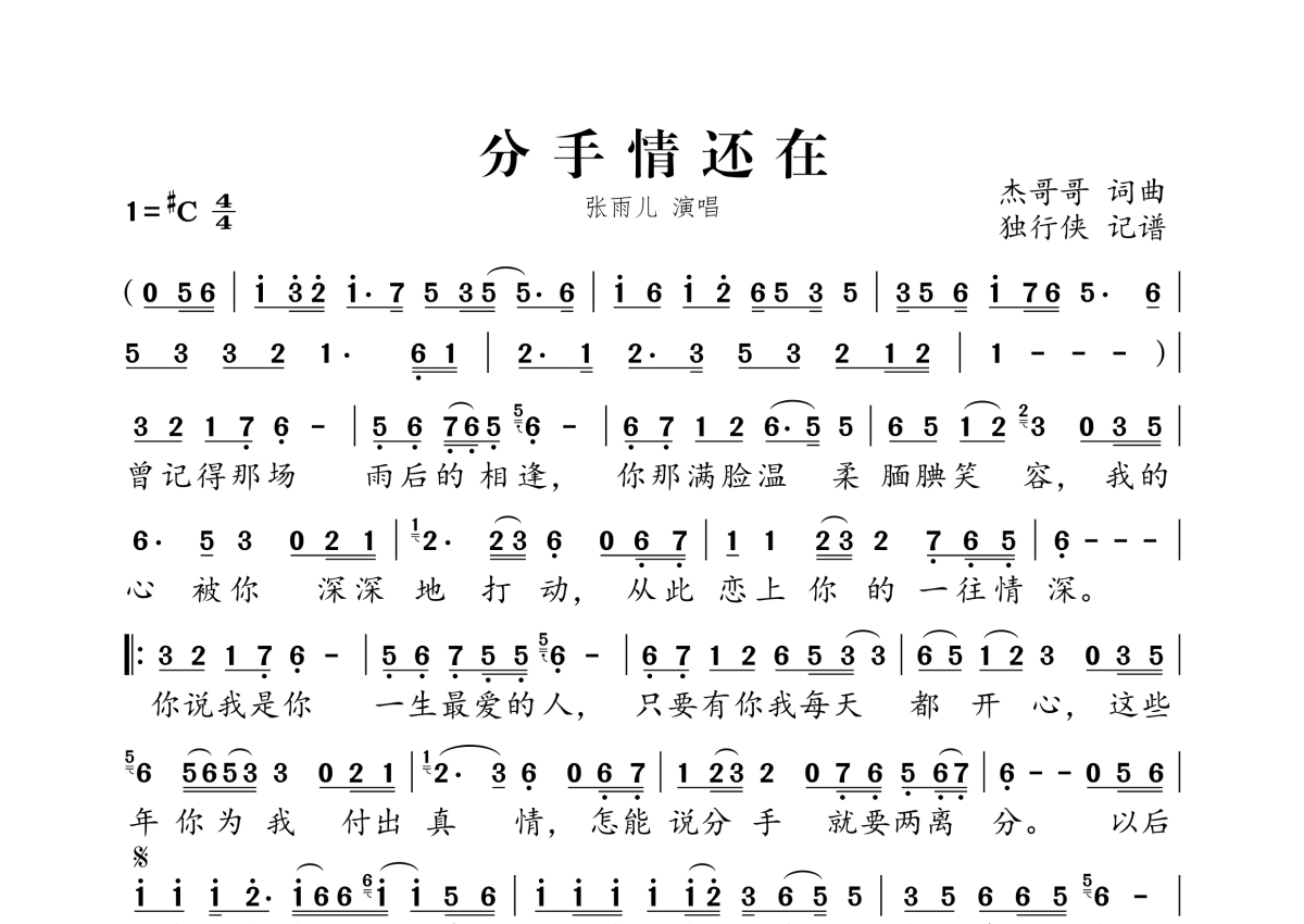 《分手情还在》是张雨儿演唱的一首歌曲,拍号为4/4拍,这份简谱共有一张高清图谱,图谱由 @独行侠 编配上传。