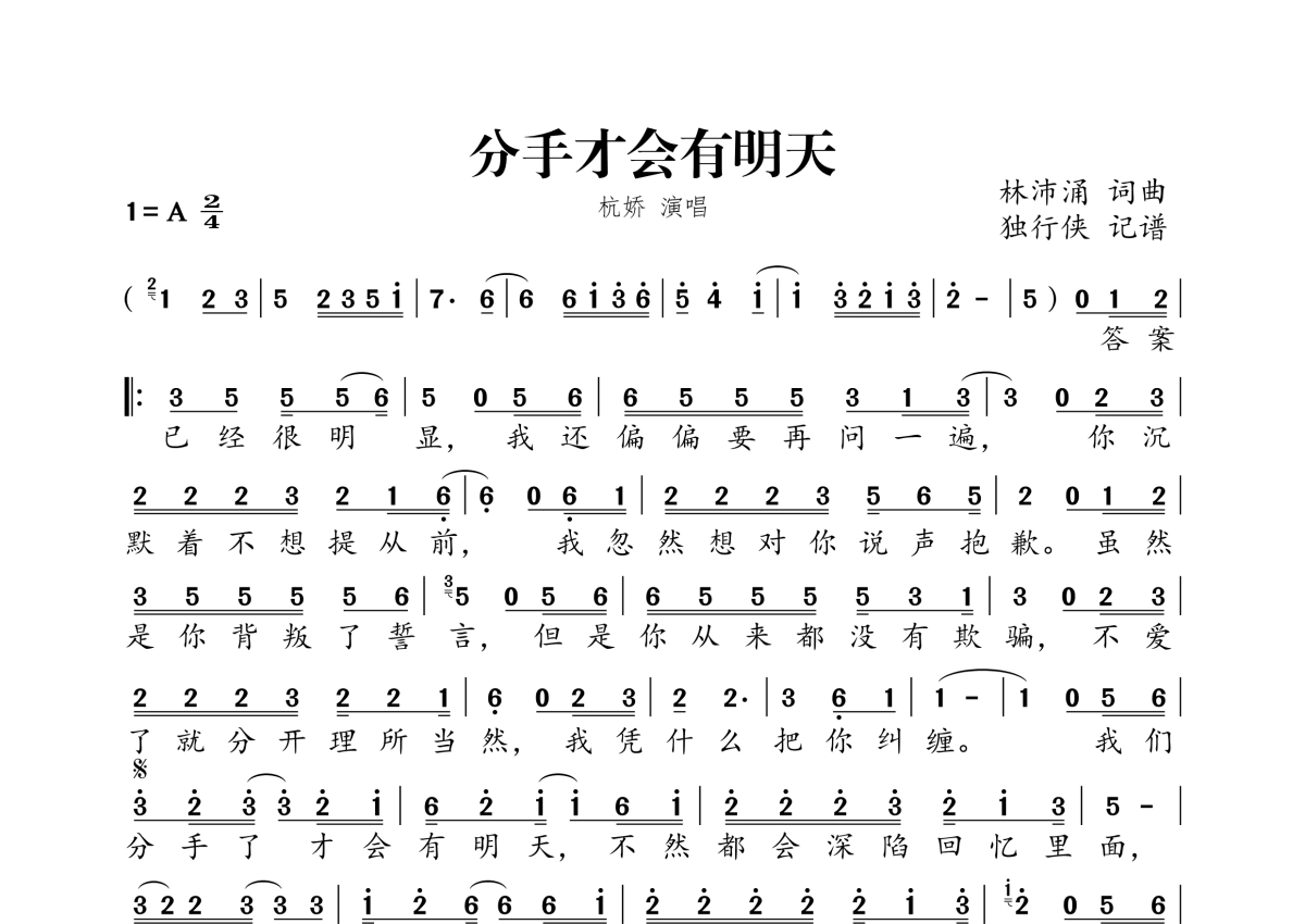 《分手才会有明天》是杭娇演唱的一首歌曲,拍号为2/4拍,这份简谱共有一张高清图谱,图谱由 @独行侠 编配上传。