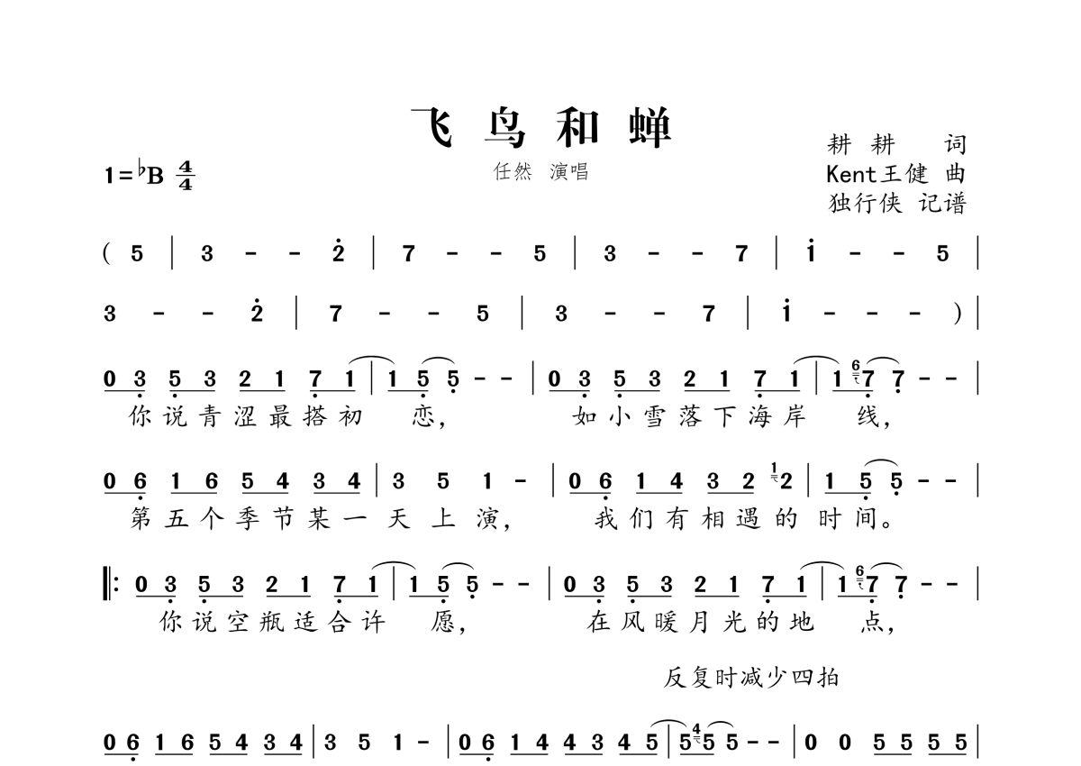 《飞鸟和蝉》是任然演唱的一首歌曲,拍号为4/4拍,这份简谱共有一张高清图谱,图谱由 @独行侠 编配上传。