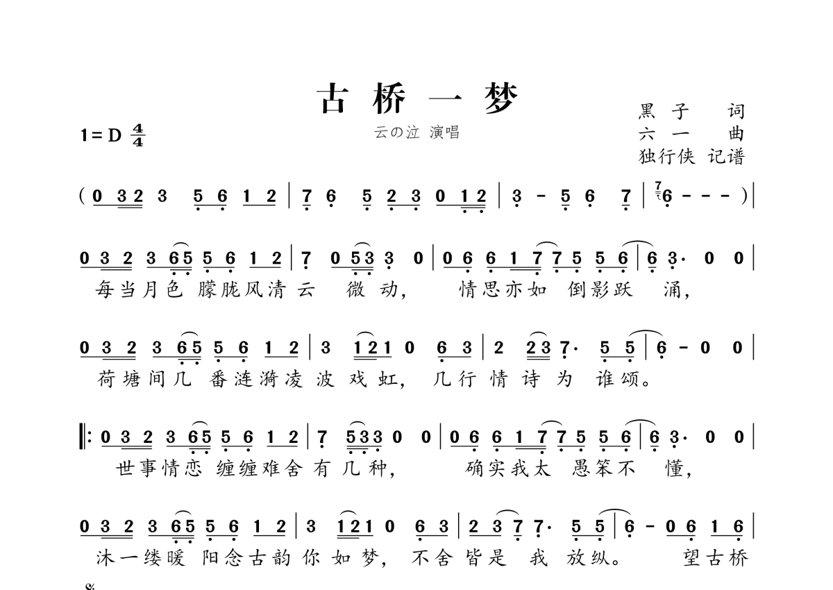 《古桥一梦》是云之泣演唱的一首歌曲,拍号为4/4拍,这份简谱共有一张高清图谱,图谱由 @独行侠 编配上传。