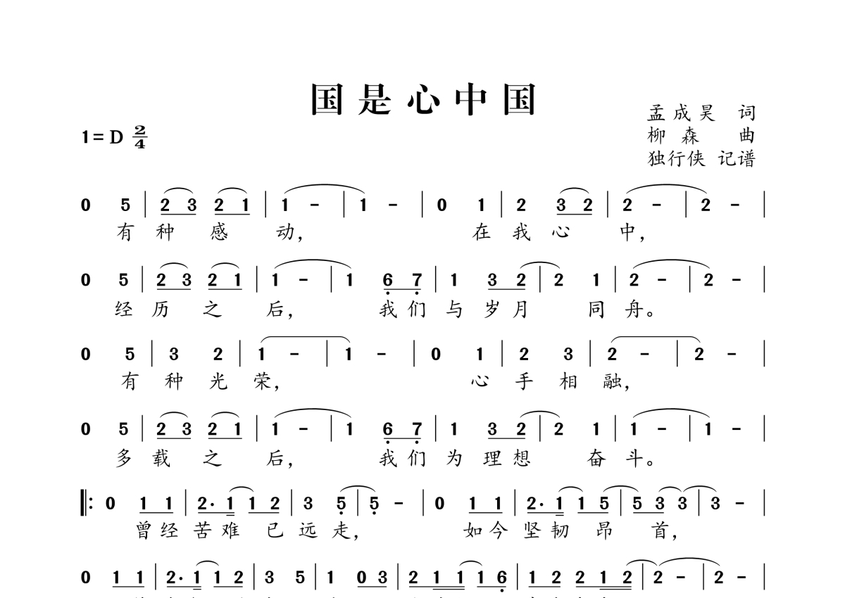 《国是心中国》,拍号为2/4拍,这份简谱共有一张高清图谱,图谱由 @独行侠 编配上传。